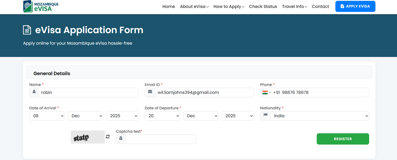 - Start Your Online Application: Navigate to the Mozambique eVisa Application form and sign up with your email and phone number. Provide your personal details, travel dates, and passport information. Next, upload the required documents and move forward with your application.